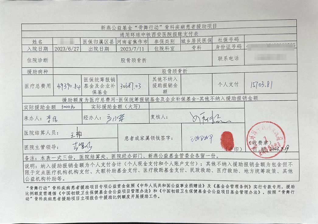 無獨有偶,69歲的申女(nǚ)士因股骨頸骨折,于6月底入住骨科(kē)治療,符合申請(qǐng)條件(jiàn)後,我院爲其提供了新燕基金3000元援助,受到了家屬的廣泛贊譽。