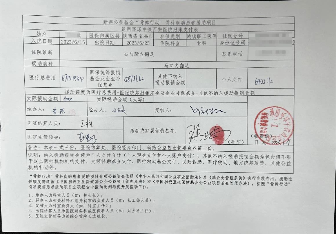 鑒于此,骨科(kē)主任姬傳磊安排護士向王某及家屬介紹了我院推出的新燕基金“骨舞行動”骨科(kē)疾病援助項目,在安排其住院治療的同時,積極對接新燕基金項目。項目負責人(rén)核實王某情況後,立即組織收集相(xiàng)關資料,并第一時間發往新燕基金項目總部,并很快(kuài)審核通過,這讓王某及家屬開心不已。