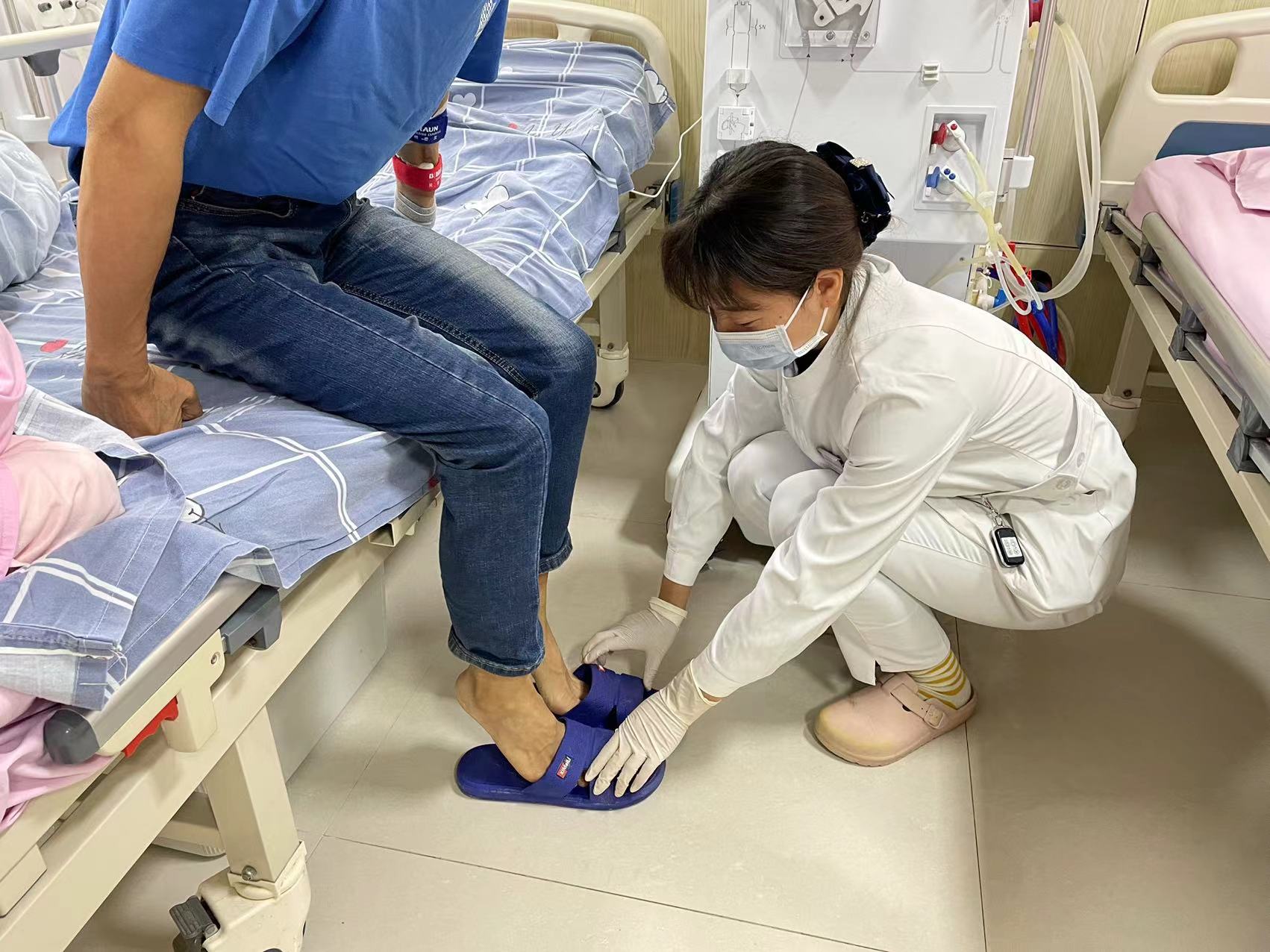 每次患者在進行爲期四個小時的治療時,需要一直保持卧位,治療結束後突然起身(shēn)可(kě)能會由于脫水引起血容量的改變。爲了保障患者的醫療安全,避免他(tā)們在透後出現頭暈、肌肉痙攣等症狀發生(shēng)跌倒。我們的護士在治療結束後,會把每位患者的鞋從(cóng)床底拿出,放(fàng)置在患者下床剛好能夠到的位置。一個個随手的動作(zuò),卻宛如(rú)點滴微光(guāng),綻放(fàng)在平凡的崗位上。