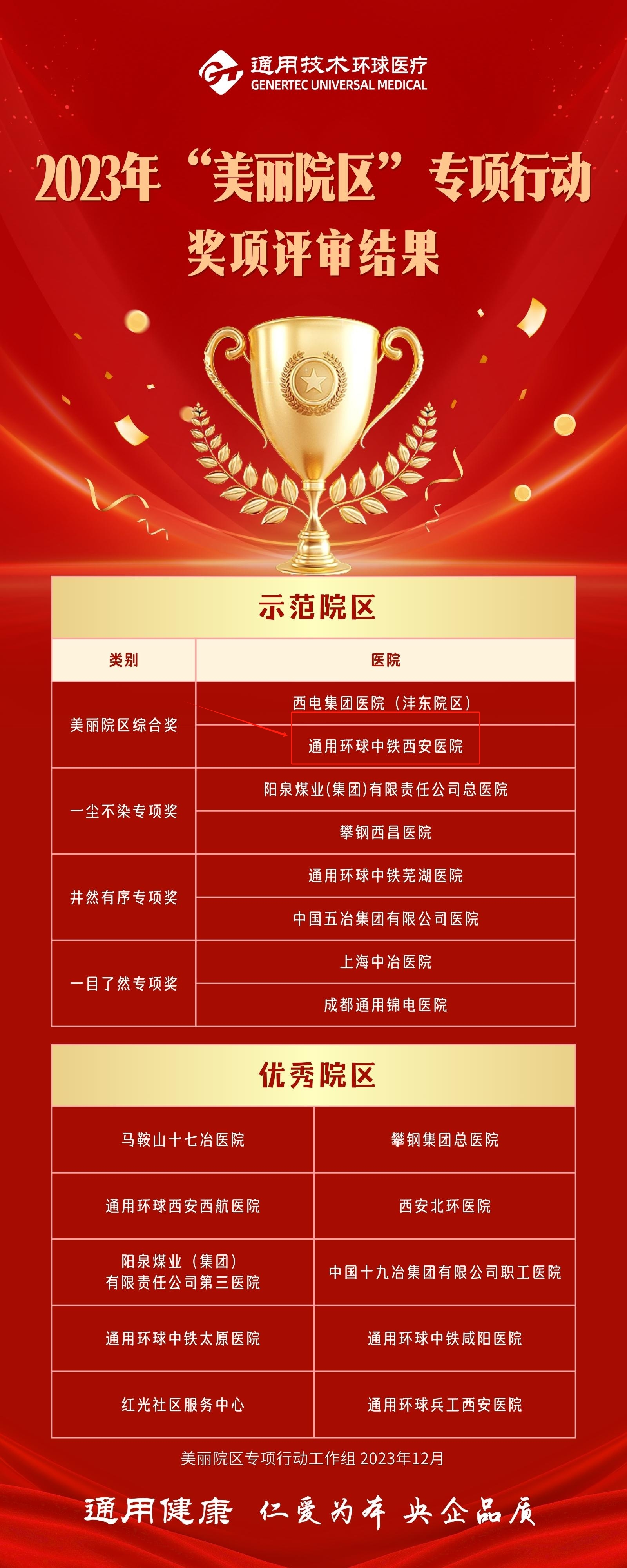 12月4日(rì),通用技術(shù)環球醫療“美麗院區”專項行動評審結果公布,通用環球中鐵西安醫院表現優異,榮獲“美麗院區綜合獎”。