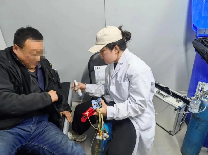 △中鐵西安醫院醫務人(rén)員(yuán)攜帶氧氣瓶爲鐵路(lù)施工(gōng)人(rén)員(yuán)進行心電圖檢查